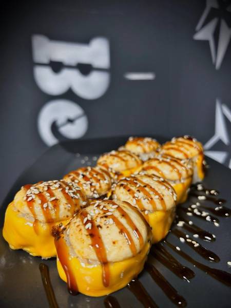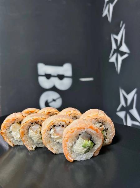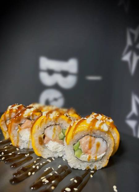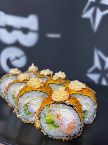 Рис, королевская креветка, сливочный сыр, лосось, кляр, соус maxxi, нори.