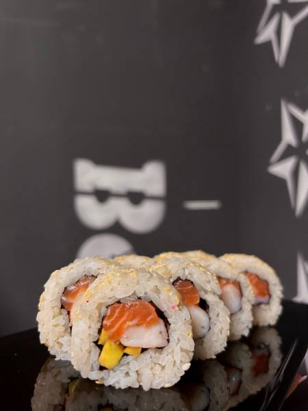 Рис, сыр, креветка, авокадо, дайкон, лосось обожженный, соус манго-чили, лепестки миндаля, икра масаго