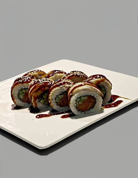 Рис, угорь, омлет, лосось, сливочный сыр, нори, соус унаги, кунжут.